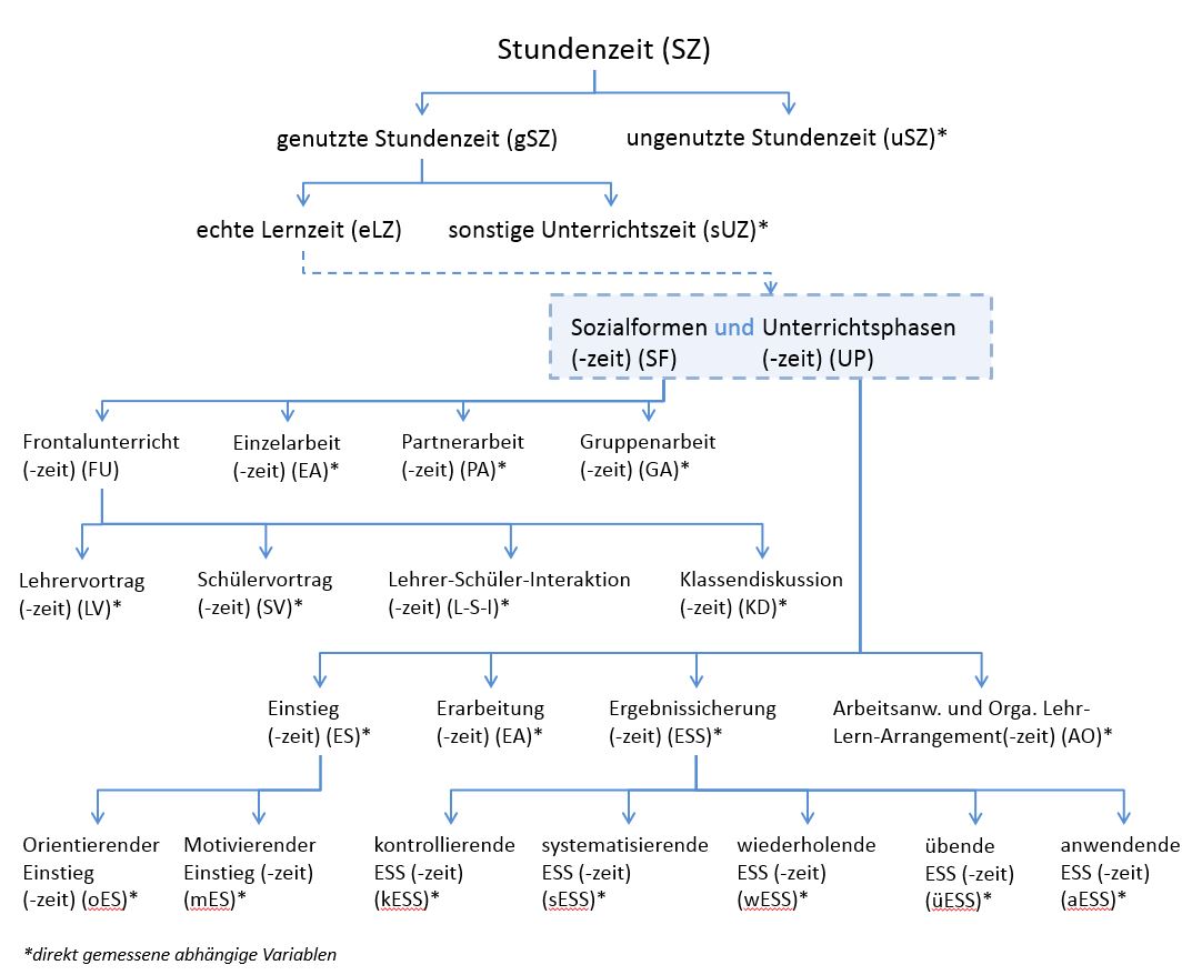 Im Mittelpunkt steht die Nutzung der Unterrichtszeit sowie die Anordnung und Verteilung der Zeit auf unterschiedliche methodische Aspekte. Qualitative Aspekte werden nicht direkt erfasst. Der Ausgangspunkt der Konzeptspezifikation ist die zur Verfügung stehende, nominelle Stundenzeit von 45 Min. pro Unterrichtsstunde. Diese Stundenzeit wird in genutzte und ungenutzteStundenzeit differenziert. Ungenutzte Stundenzeit entsteht aufgrund von Verspätungen, Unterbrechungen oder vorzeitiger Beendigung des Unterrichts. Die genutzte Stundenzeit setzt sich aus der echten Lernzeit und der sonstigen Unterrichtszeit zusammen. Die sonstige Unterrichtzeit entfällt auf Zeitanteile, die der ziel- und inhaltsorientierten Lernzeit nicht zugerechnet werden können. Das sind z. B. Belehrungen, Klassenbucheintragungen oder erhebliche Disziplinkonflikte sowie deren Bearbeitung. Es handelt sich demnach um relevante organisatorische oder disziplinarische Aktivitäten, die für das Funktionieren von Schule und Unterricht bedeutsam sind. Innerhalb der echten Lernzeit werden nun die zwei Dimensionen der didaktischen Gestaltung des Unterrichts (Sozialformen und Unterrichtphasen) fokussiert (s. Abb. 1).