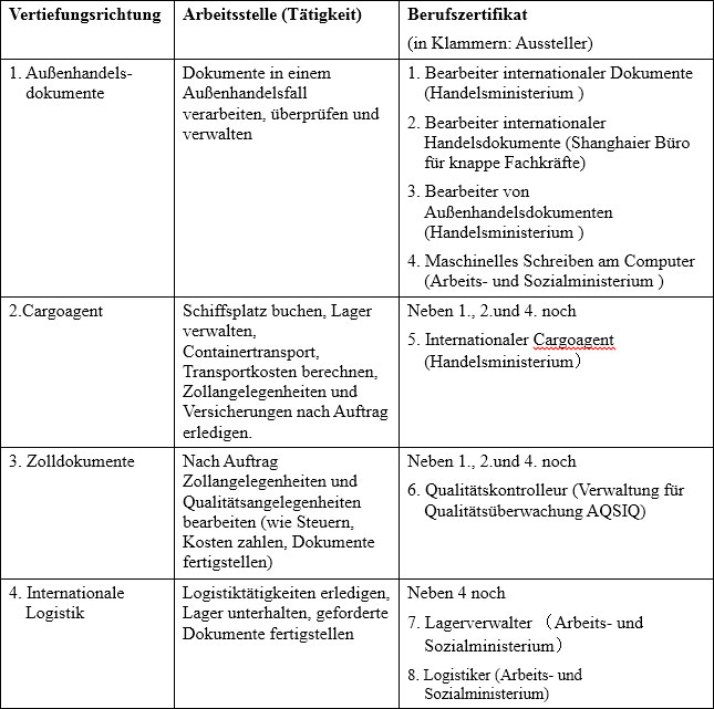 Tabelle 1: Bildungsgang im Bereich Außenhandel in Shanghai mit Vertiefungsrichtungen und Abschlüssen (Shanghai 2006)