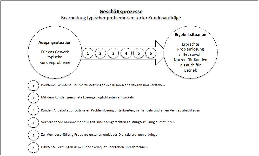 In Gewerben mit primär vorproduzierenden Arbeits- und Geschäftsprozessen liegt die Fokussierung der Tätigkeiten auf Kundengruppen. Aus diesem Grund orientieren sich die einzelnen Prozessschritte an der Befriedigung von Kundenbedürfnissen, welche aggregiert für eine Gruppe von Kunden antizipiert werden. Es ergeben sich zwei Handlungsfelder: Der Produktentwicklungsprozess (Handlungsfeld 1) sowie die Erstellung der Produkte und deren Kontrolle und Übergabe an die Kunden (Handlungsfeld 2). Im Handlungsfeld 3 werden die Aspekte der auftragsübergreifenden, jedoch gewerbespezifischen, Betriebsführung und -organisation aufgegriffen.