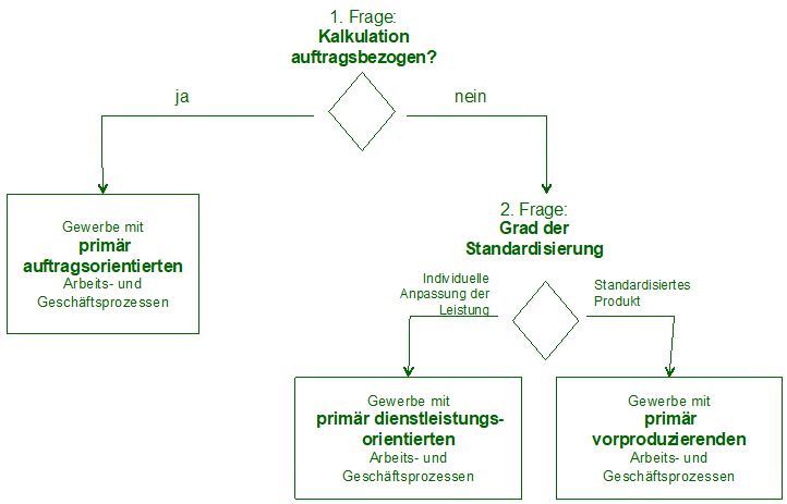 Diese Frage ermöglicht die Unterscheidung zwischen Gewerben mit primär auftragsorientierten Arbeits- und Geschäftsprozessen auf der einen Seite und Gewerben mit primär dienstleistungsorientierten und primär vorproduzierenden Arbeits- und Geschäftsprozessen auf der anderen Seite.