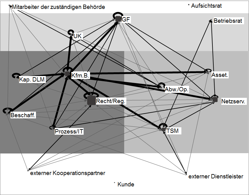 Beispiel: Im abgebildeten Fall zur Personalentwicklung wird zum einen innerhalb des Bereichs Kfm.B.. besonders intensiv miteinander kommuniziert und kooperiert. Zum anderen tauschen die Akteure sehr häufig Informationen mit allen anderen Fachbereichen aus. In der Gegenüberstellung der beiden Netzwerkbilder „formal“ und „informal“ wird ersichtlich, dass der Bereich Kfm.B. den Prozess mitverantwortet. Der Einfluss der Geschäftsführung (GF) und des Bereichs Recht./Reg. ist jedoch stärker als angedacht, weil es über die definierten Beziehungen hinaus zudem weitere dichte Quer-Beziehungen zwischen den kaufmännisch-verwaltenden sowie gewerblich-technischen Fachbereichen, der Geschäftsführung und externen Personen gibt.