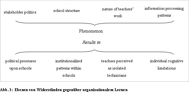 Aus der Perspektive des Konzepts des organisationalen Lernens nimmt Rait (1995, S. 89) eine Typisierung der Blockaden vor, die diesem Lernen in Schulen entgegenstehen, wobei er für jede Ebene Phänomene und Auswirkungen unterscheidet (vgl. Abb. 1).